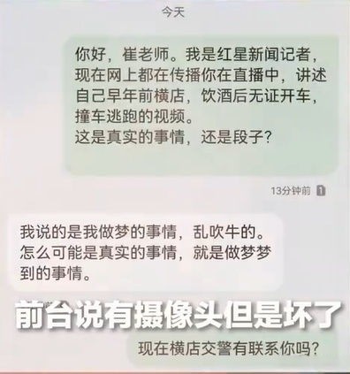 根据《红星新闻》报导,崔漫莉在被问到关于无照酒驾一事是否为真实事件时,透过简讯回覆说:「我说的是我做梦的事情,乱吹牛的。怎么可能是真实的事情,就是做梦梦到的事情。」否认自己危险驾车。
